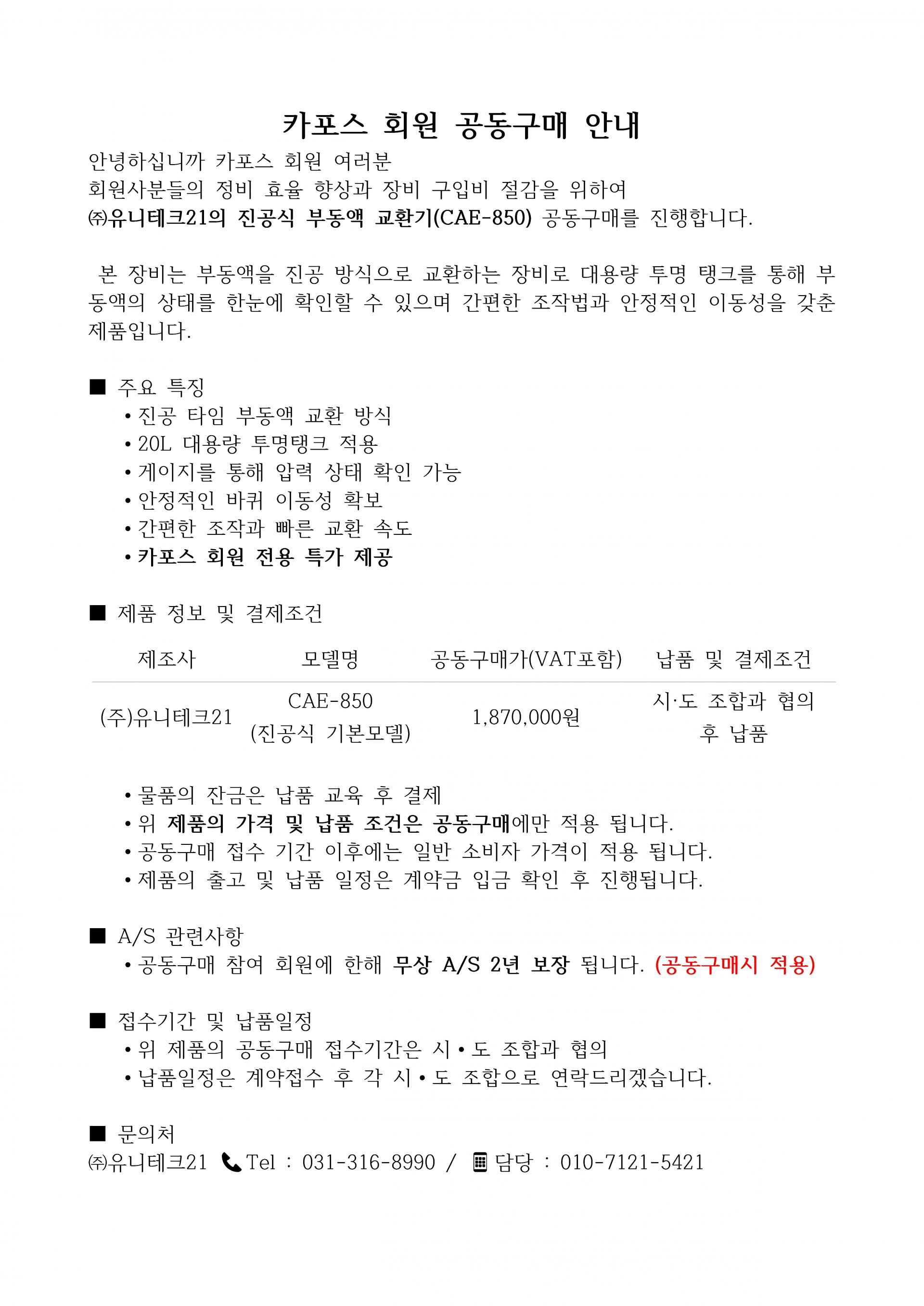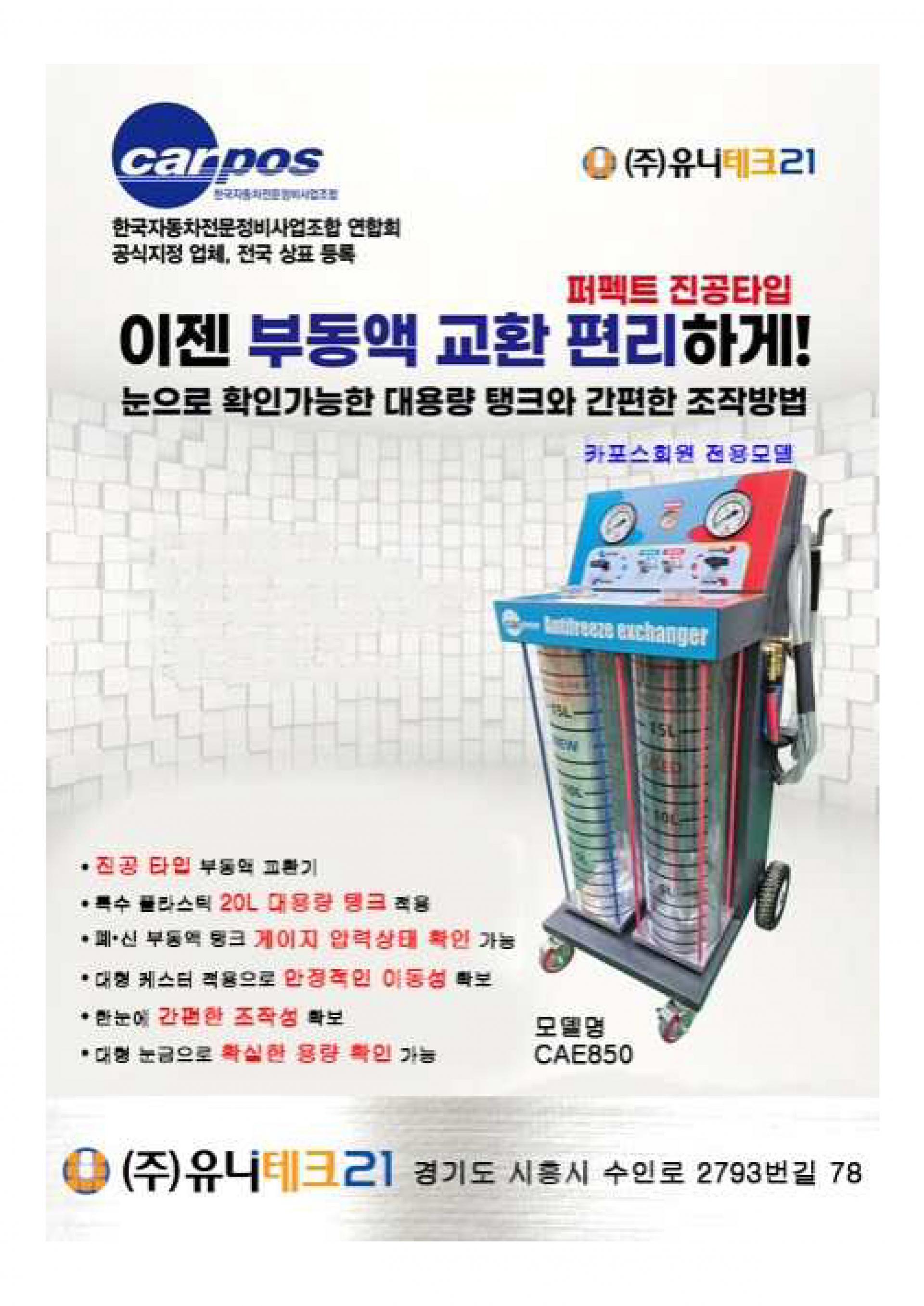 2⃣ 유니테크21 / 부동액교환기 (모델: CAE850) / 공동구매가 1,870,000 (vat 포함)